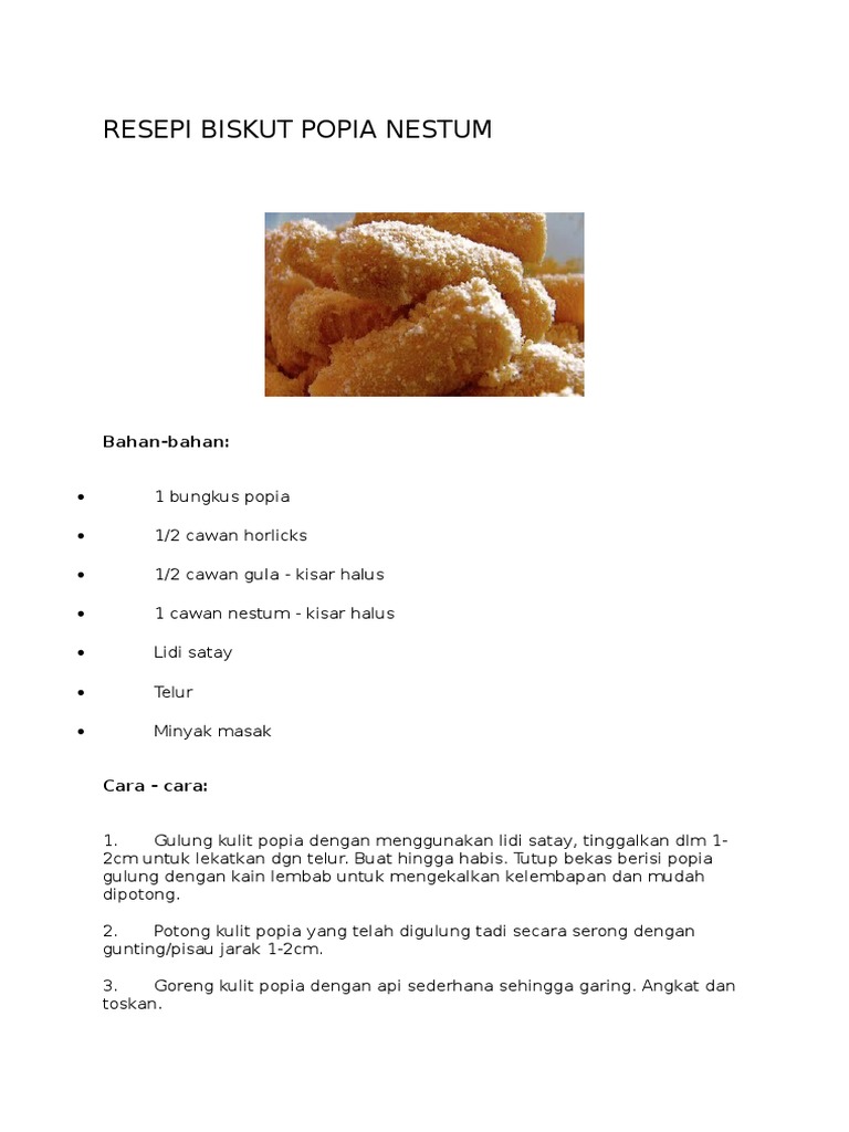B Untuk gam popia. Sudah tentu ini masakan Resepi popia gulung nestum Cara Membuat Resepi Biskut Popia Nestum Jom lihat apa bahan-bahannya dan bagaimana cara membuatnya. Hindarkan kulit popia mentah dari terkena kipas angin kerana ianya mudah liat dan keras.